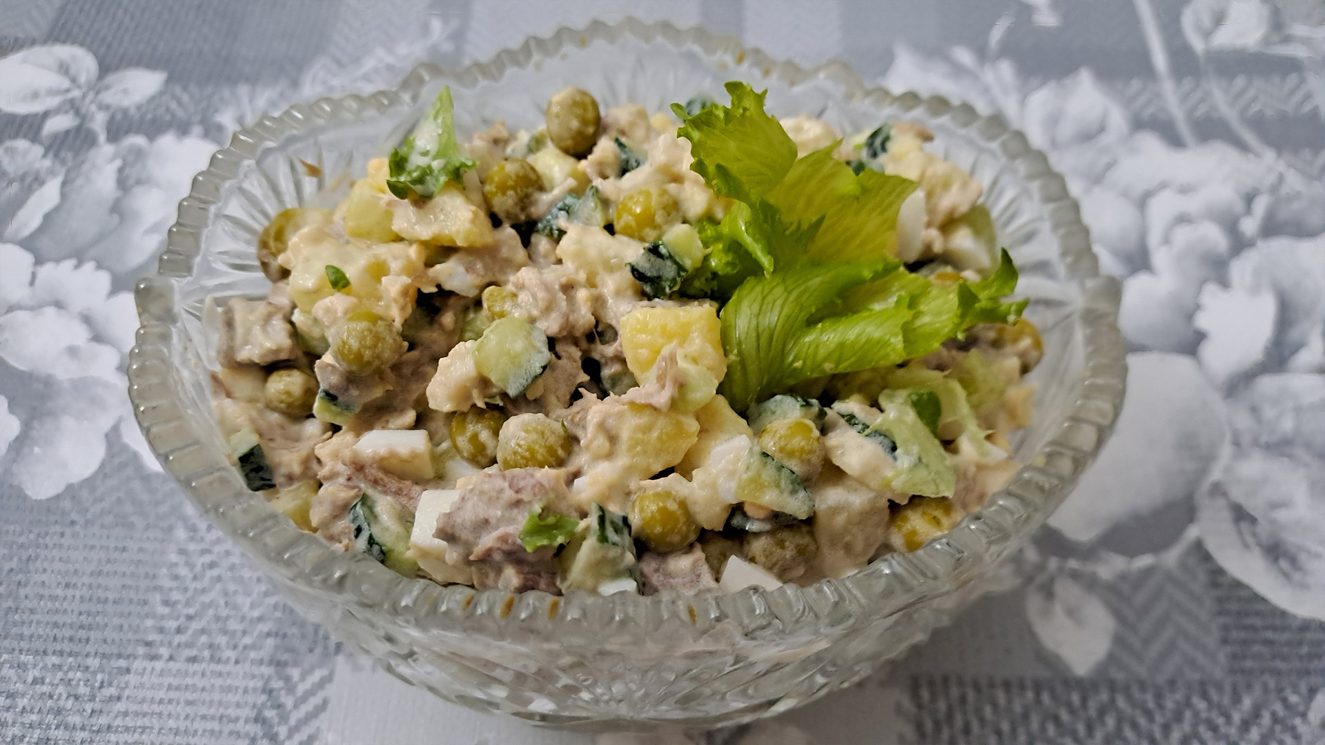 Вкусный и сытный салат на праздник или на каждый день, с ноткой пикантности и свежестью. Ингредиенты: отварная говядина, картофель, свежие огурцы, яблоки, яйца, консервированный зеленый горошек, листья зеленого салата, майонез …