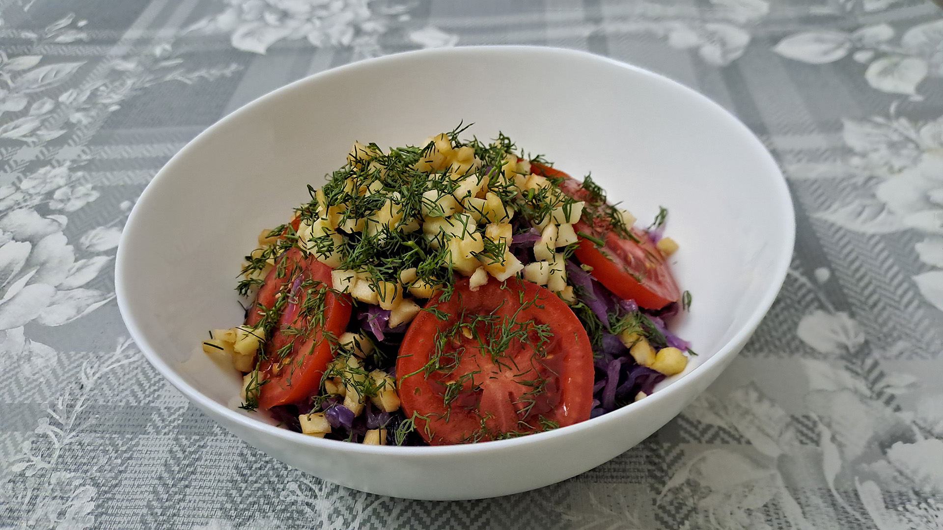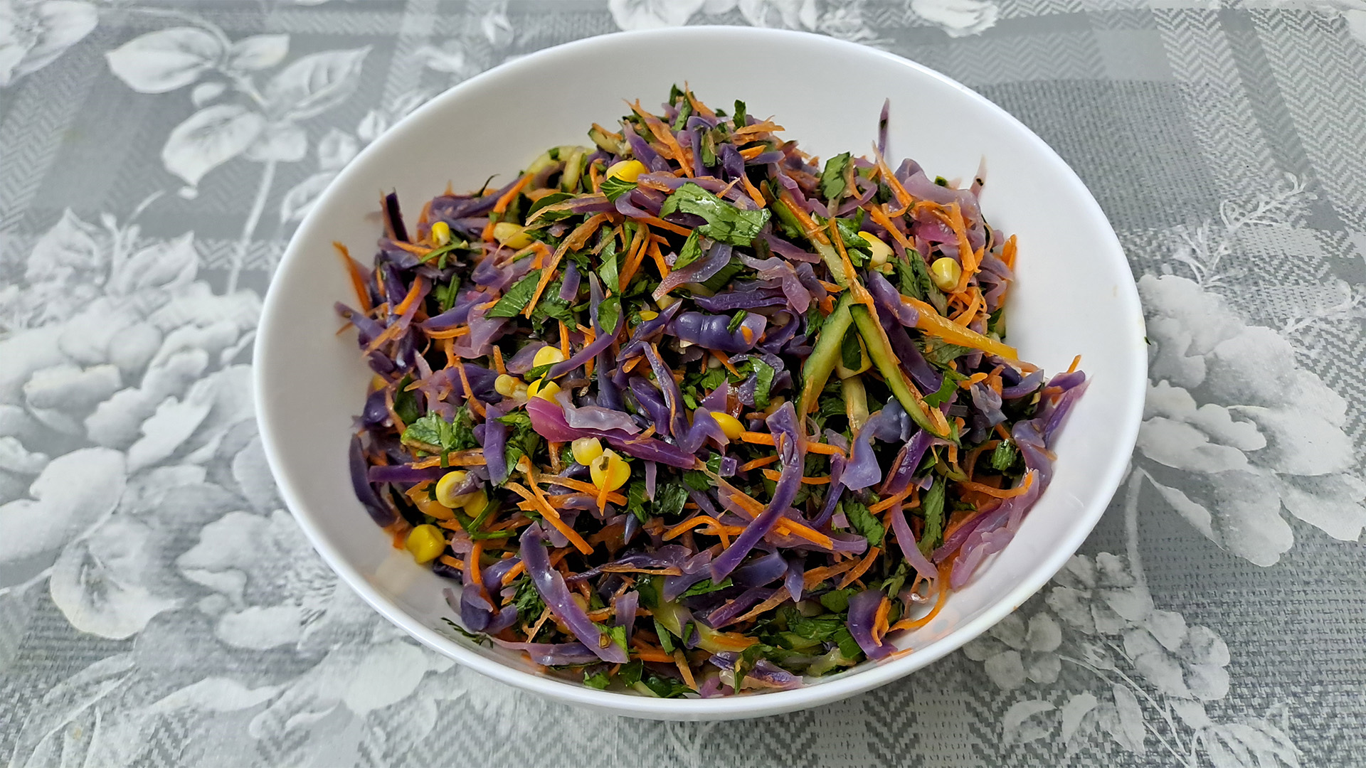 Низкокалорийный (67 ккал на 100 г), полезный и вкусный овощной салат для легкого завтрака, ужина или дополнения к обеду. Ингредиенты: краснокочанная капуста, свежие морковь и огурцы, болгарский перец, консервированная …