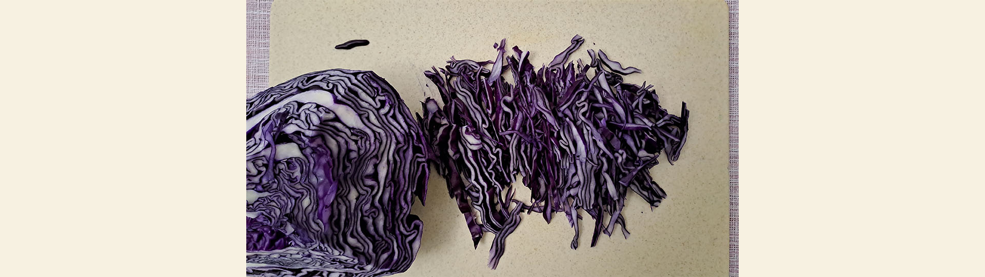 Шаг 1. Кочан краснокочанной капусты очищаем, обмываем, обсушиваем, разрезаем на 4 части и удаляем кочерыжку. Капусту тонко шинкуем (500 г).