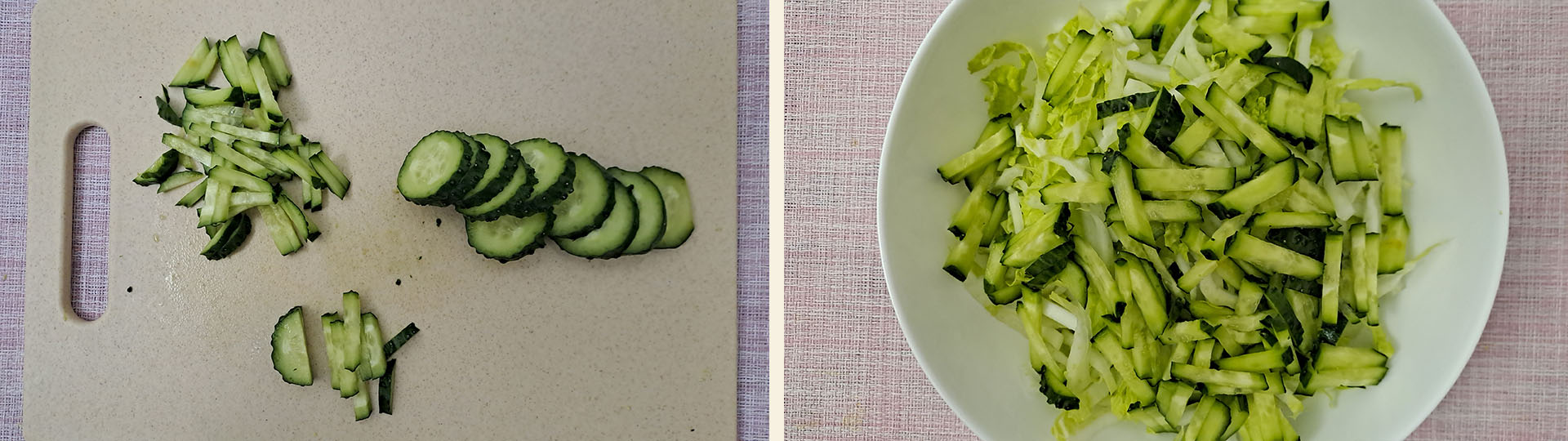 Нарезаем огурцы соломкой, выкладываем в миску