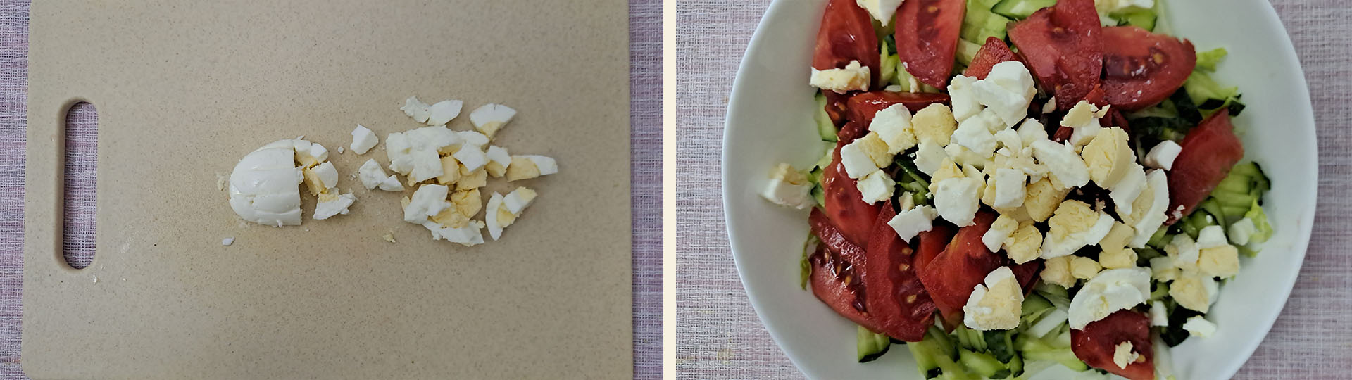 Шаг 5. Отваренные вкрутую яйца (1 шт.), очищаем от скорлупы, нарезаем небольшими кубиками и выкладываем в миску к остальным ингредиентам.