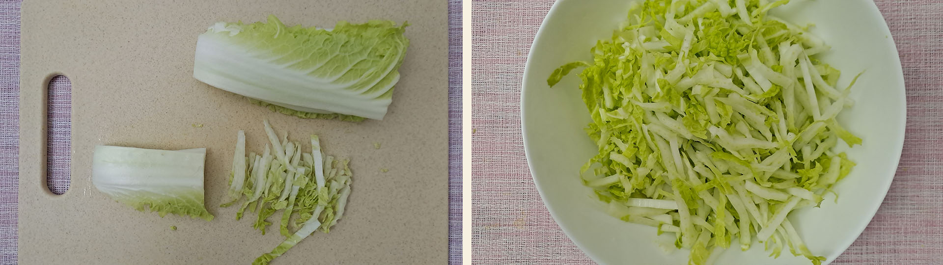 Шаг 2. Пекинскую капусту очищаем, промываем, обсушиваем (при необходимости при очистке разбираем капусту на отдельные листья), разрезаем вдоль на две части и нарезаем соломкой. Нарезанную пекинскую капусту (150 г) выкладываем в миску для сбора салата.