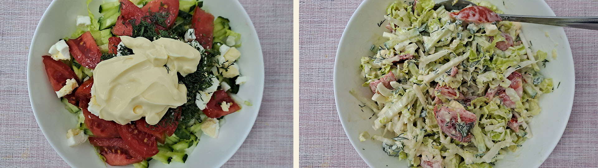 Пошаговое приготовление вкусного низкокалорийного овощного салата для легкого полезного завтрака или ужина. Ингредиенты: пекинская капуста, свежие огурцы и помидоры, яйца, зелень укропа, майонез и специи.