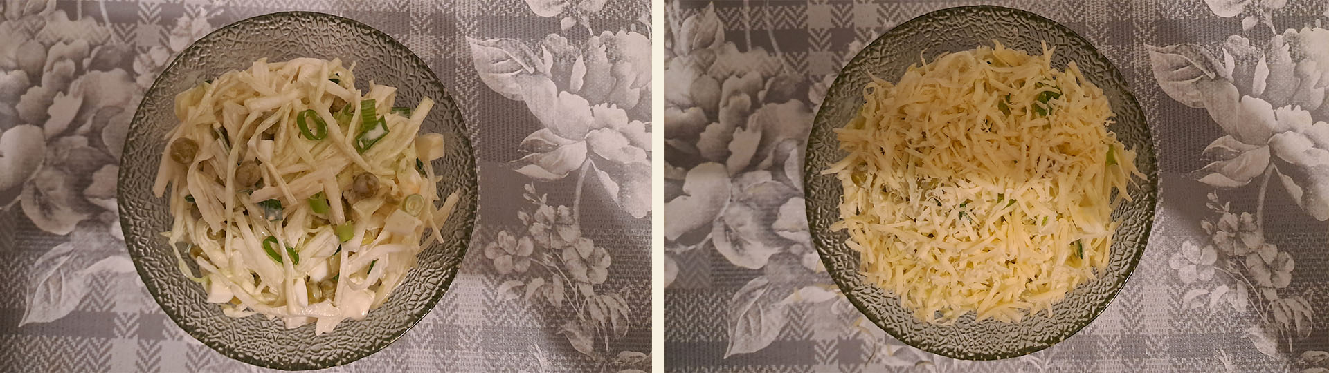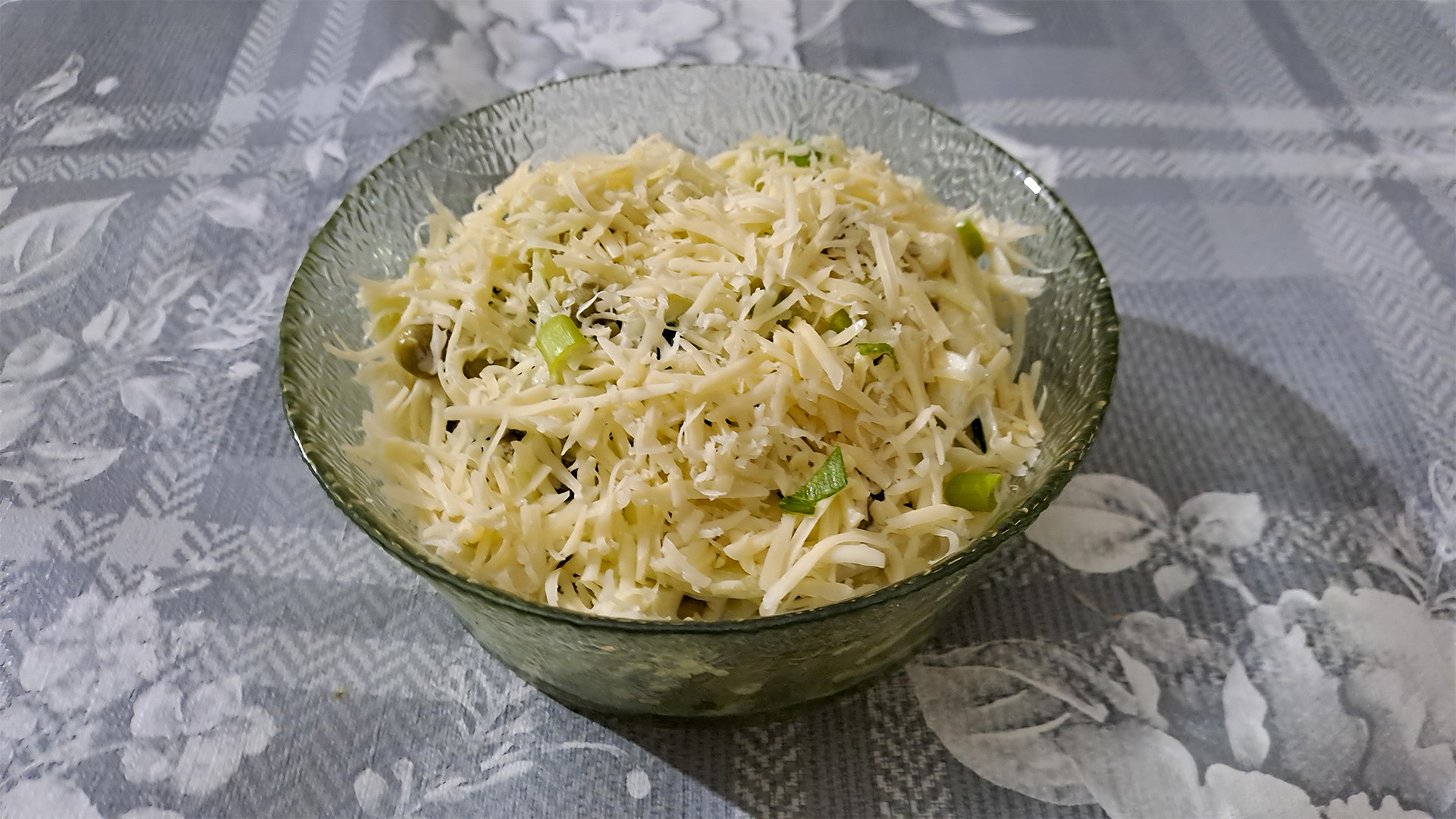 Шаг 7. Готовый салат выкладываем в салатник и посыпаем сверху натертым сыром.