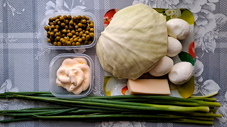 Ингредиенты салата из свежей капусты с зеленым горошком и яйцом