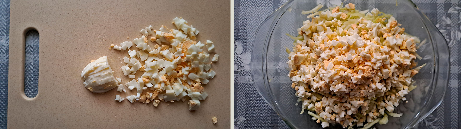 Шаг 4. Отваренные вкрутую яйца (4 шт.) очищаем от скорлупы, нарезаем небольшими кубиками и выкладываем в миску с капустой.