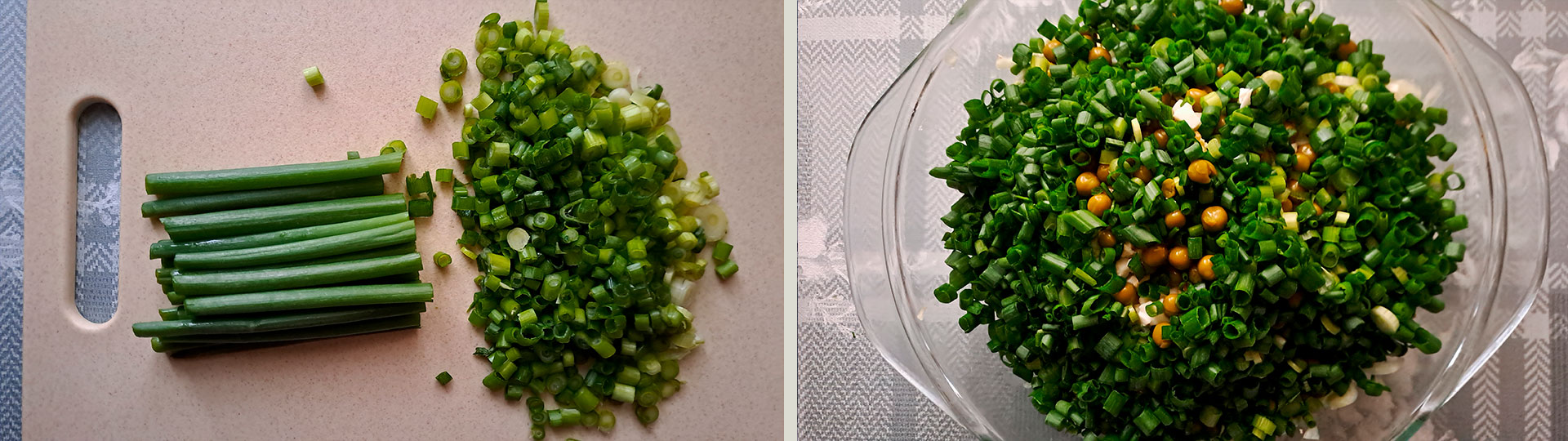 Шаг 6. Зеленый лук промываем под проточной водой, обсушиваем и мелко нарезаем. Выкладываем в миску (100 г).